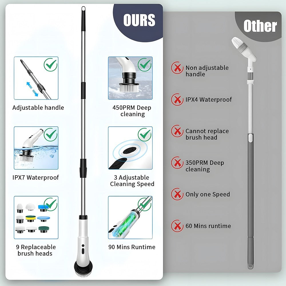 Upgrade your cleaning routine with the Electric Spin Scrubber, a powerful cordless cleaning brush designed to tackle dirt, grime, and soap scum effortlessly. Equipped with 9 replaceable brush heads, it’s perfect for scrubbing showers, bathtubs, tiles, floors, kitchen surfaces, and more. The long handle allows easy reach without bending, making it ideal for elderly users or anyone wanting a hassle-free clean. With fast rotation speed, rechargeable battery, and waterproof design, this scrubber makes home cleaning faster, easier, and more effective.